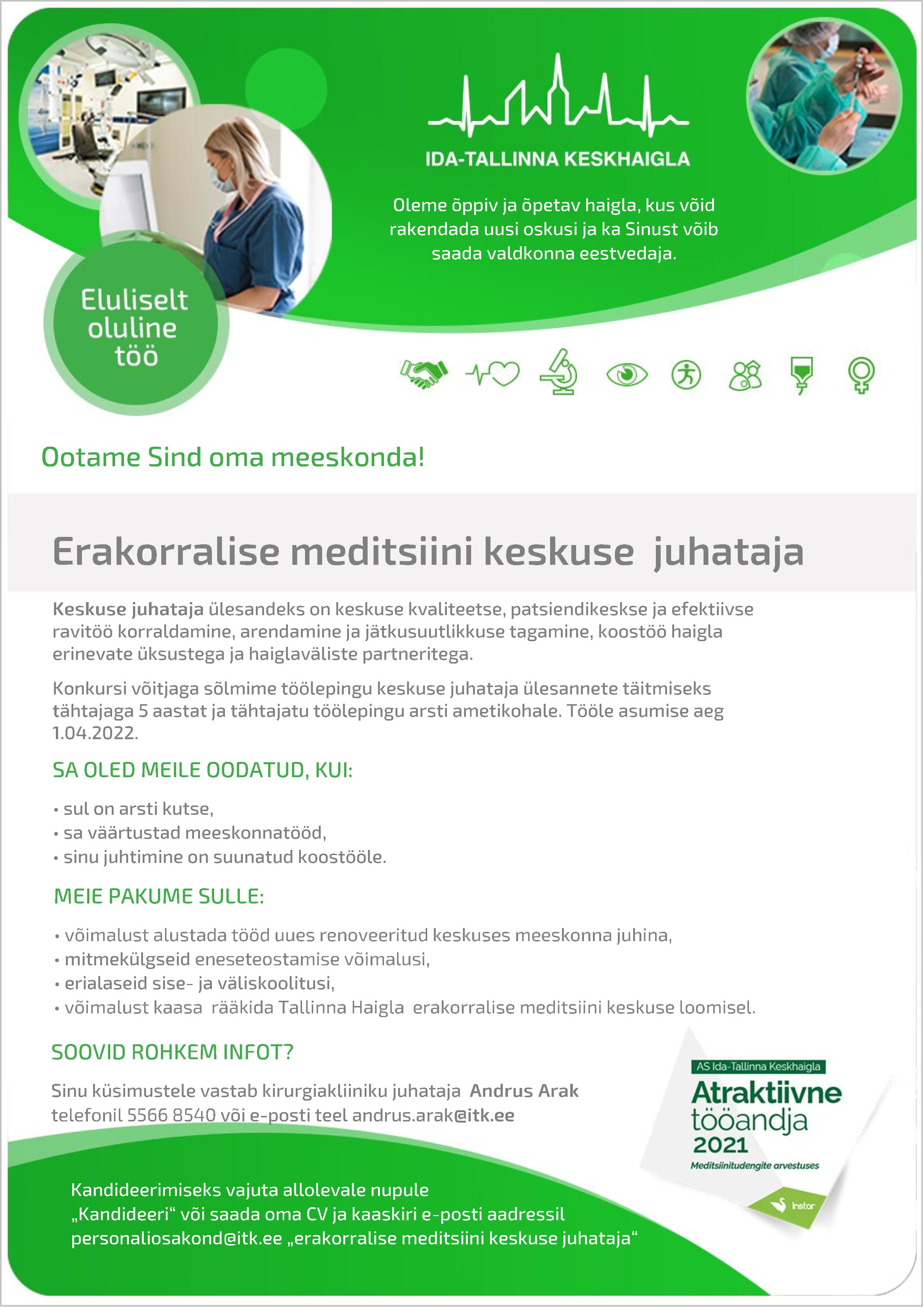 Ida-Tallinna Keskhaigla otsib ERAKORRALISE MEDITSIINI KESKUSE JUHATAJAT!