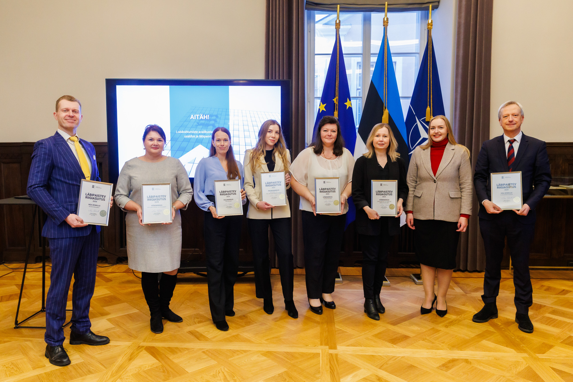 Justiits- ja Digiministeerium tunnustas eile, 28. jaanuaril Eesti esindushoones asutusi, kes on kõige eeskujulikumalt teavitanud oma lobikohtumistest ning panustanud läbipaistvasse ja usaldusväärsesse poliitikakujundamisse. Terviseamet pälvis kuldmärgise, Sotsiaalministeerium kiidusõnad.