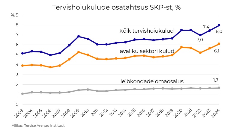 2023. aastal alanud tervishoiukulude osatähtsuse tõus sisemajanduse koguproduktist (SKP) jätkus ning ulatus 8%-ni, kuna tervishoiukulud kasvasid kiiremini kui SKP, selgub TAI statistikast.